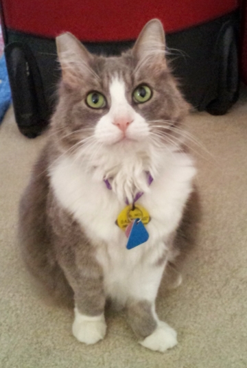 The brat, a/k/a Y. Pestis (Why Pestis? Because he is...a pest). Moose, because when he wants your attention, he wants ALL of your attention. Beethoven is a long haired Grey with white markings and very short legs. Not all of which he remembers to fire when jumping. No short term memory - every 90 seconds, he meets somebody new, even if he just ran out of the room and back in. Let's just leave it that when they were passing out brains he said "Don't need any, I'm cute".